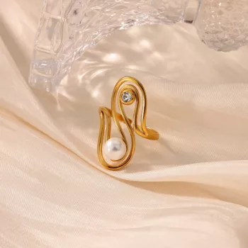 18K Gold Plated Stainless Steel Geometric Imitation Pearl Ring for Women