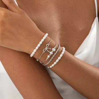 4Pcs Elegant Pearl Chain Bracelets with Vintage Bowknot Design
