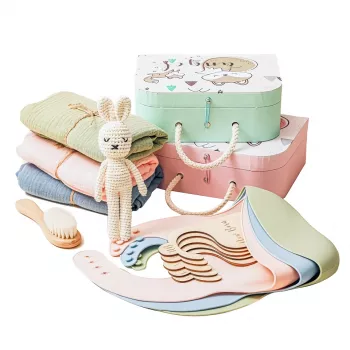 Baby Bath Gift Set - 100% Cotton Towel, Silicone Bib, Bath Brush & Bunny Puppet