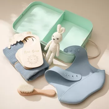 Baby Bath Gift Set - 100% Cotton Towel, Silicone Bib, Bath Brush & Bunny Puppet