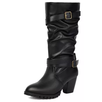 Women's Mid-Calf Pleated Western Boots - Buckle Detail, Low Heels, Plus Sizes